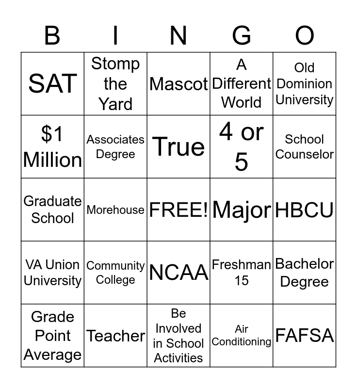 This bingo card has a free space and 24 words: Community College, Teacher, True, Grade Point Average, Old Dominion University, SAT, $1 Million, Stomp the Yard, Major, NCAA, 4 or 5, Graduate School, Freshman 15, Bachelor Degree, Associates Degree, Air Conditioning, HBCU, Mascot, School Counselor, Morehouse, FAFSA, VA Union University, A Different World and Be Involved in School Activities.