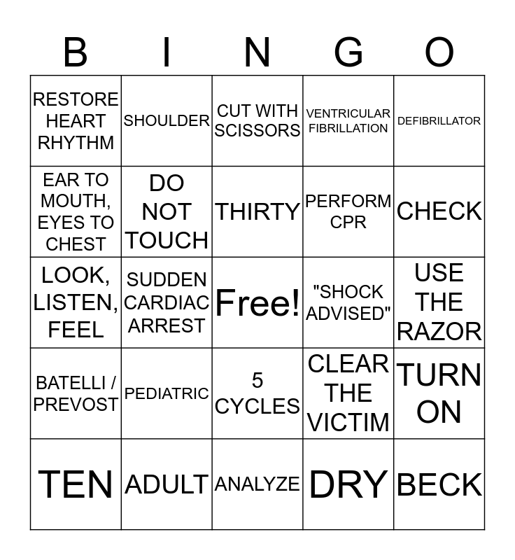 This bingo card has a free space and 24 words: PEDIATRIC, ADULT, THIRTY, TEN, DEFIBRILLATOR, RESTORE HEART RHYTHM, EAR TO MOUTH, EYES TO CHEST, SHOULDER, "SHOCK ADVISED", 5 CYCLES, PERFORM CPR, LOOK, LISTEN, FEEL, CLEAR THE VICTIM, TURN ON, DO NOT TOUCH, DRY, USE THE RAZOR, CUT WITH SCISSORS, CHECK, SUDDEN CARDIAC ARREST, BECK, BATELLI / PREVOST, VENTRICULAR FIBRILLATION and ANALYZE.
