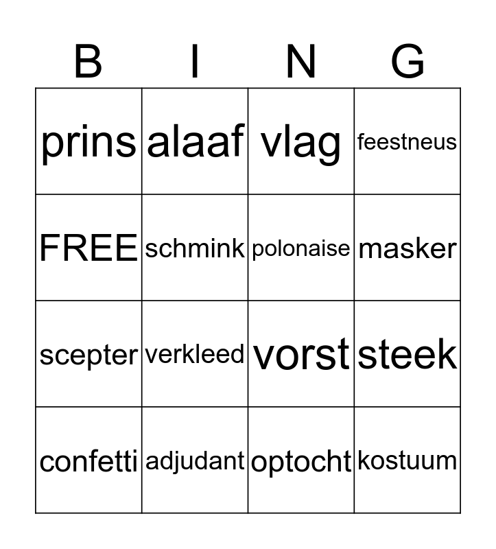 This bingo card has 16 words: adjudant, steek, vlag, prins, scepter, alaaf, vorst, optocht, FREE, schmink, confetti, feestneus, verkleed, masker, polonaise and kostuum.