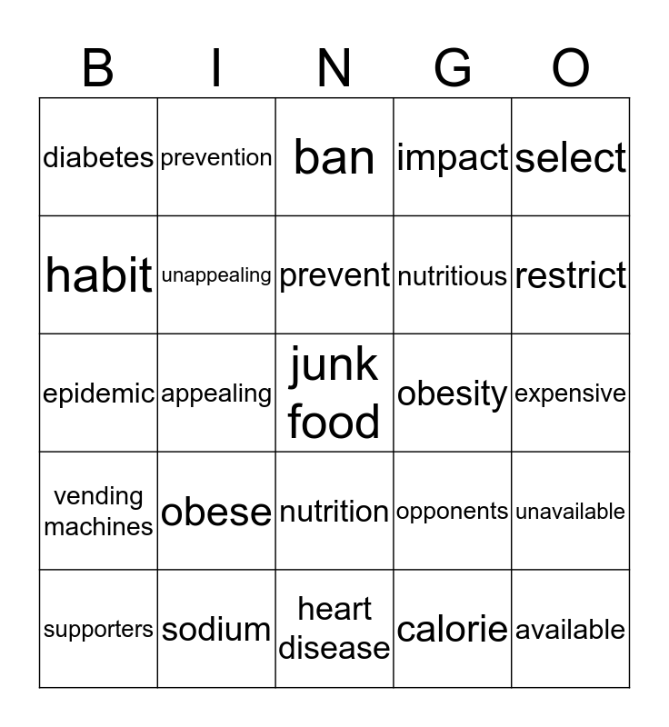 This bingo card has 25 words: obese, heart disease, prevent, supporters, select, diabetes, habit, prevention, obesity, nutrition, nutritious, epidemic, opponents, unavailable, unappealing, available, expensive, ban, restrict, appealing, junk food, sodium, vending machines, impact and calorie.