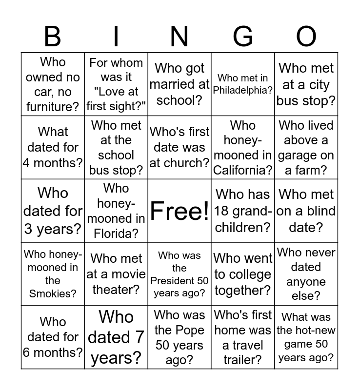 This bingo card has a free space and 24 words: Who met at a movie theater?, Who dated 7 years?, Who's first date was at church?, Who dated for 6 months?, Who met at a city bus stop?, Who owned no car, no furniture?, What dated for 4 months?, For whom was it "Love at first sight?", Who has 18 grand-children?, Who was the President 50 years ago?, Who honey-mooned in California?, Who dated for 3 years?, Who went to college together?, Who never dated anyone else?, Who met at the school bus stop?, Who's first home was a travel trailer?, Who met on a blind date?, Who got married at school?, Who lived above a garage on a farm?, Who honey-mooned in Florida?, What was the hot-new game 50 years ago?, Who honey-mooned in the Smokies?, Who met in Philadelphia? and Who was the Pope 50 years ago?.