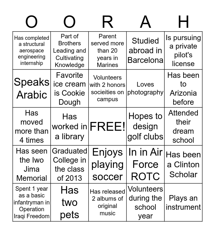 This bingo card has a free space and 24 words: Graduated College in the class of 2013, Has two pets, Volunteers with 2 honors socieities on campus, Spent 1 year as a basic infantryman in Operation Iraqi Freedom, Is pursuing a private pilot's license, Has completed a structural aerospace engineering internship, Speaks Arabic, Part of Brothers Leading and Cultivating Knowledge, Hopes to design golf clubs, Enjoys playing soccer, Loves photography, Has moved more than 4 times, In in Air Force ROTC, Has been a Clinton Scholar, Favorite ice cream is Cookie Dough, Volunteers during the school year, Attended their dream school, Parent served more than 20 years in Marines, Has been to Arizonia before, Has worked in a library, Plays an instrument, Has seen the Iwo Jima Memorial, Studied abroad in Barcelona and Has released 2 albums of original music.