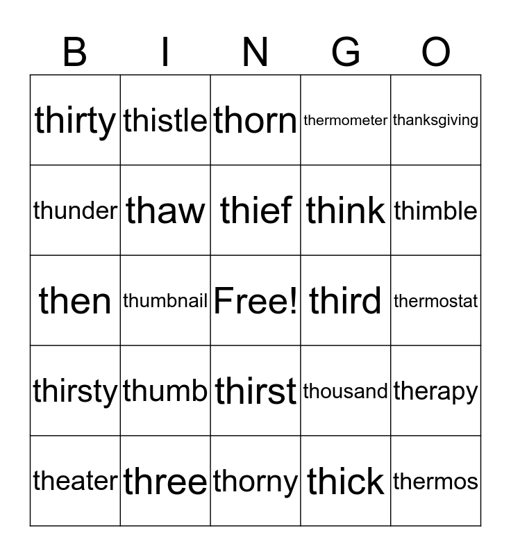 This bingo card has a free space and 24 words: thumb, three, thief, theater, thanksgiving, thirty, thunder, thistle, third, thirst, think, then, thousand, therapy, thaw, thick, thermostat, thorn, thimble, thumbnail, thermos, thirsty, thermometer and thorny.