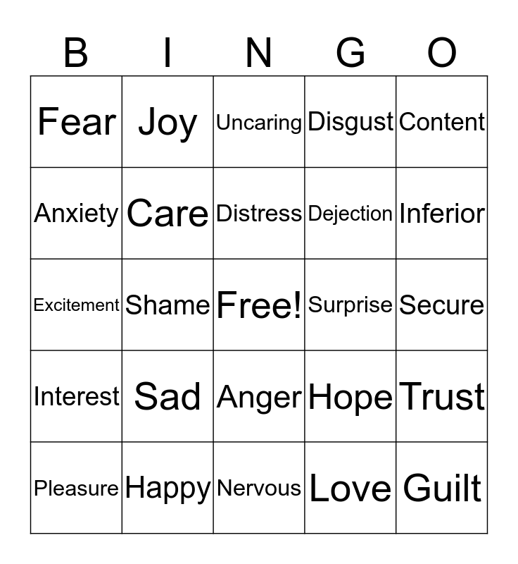 This bingo card has a free space and 24 words: Sad, Happy, Distress, Pleasure, Content, Fear, Anxiety, Joy, Surprise, Anger, Dejection, Excitement, Hope, Trust, Care, Love, Secure, Uncaring, Inferior, Shame, Guilt, Interest, Disgust and Nervous.