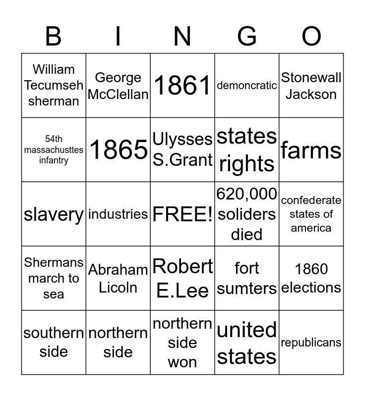 This bingo card has a free space and 24 words: Abraham Licoln, northern side, Ulysses S.Grant, southern side, Stonewall Jackson, William Tecumseh sherman, 54th massachusttes infantry, George McClellan, 620,000 soliders died, Robert E.Lee, states rights, slavery, fort sumters, 1860 elections, 1865, united states, confederate states of america, 1861, farms, industries, republicans, Shermans march to sea, demoncratic and northern side won.