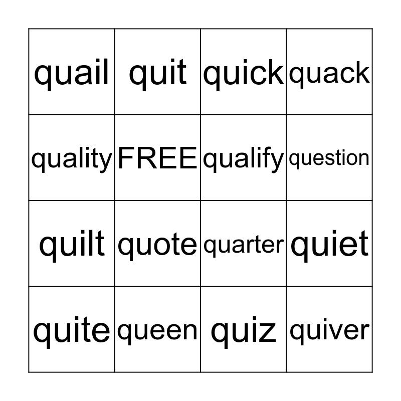 This bingo card has 16 words: queen, quiet, quick, quail, quilt, quit, quarter, quiz, quality, FREE, quite, quack, quote, question, qualify and quiver.