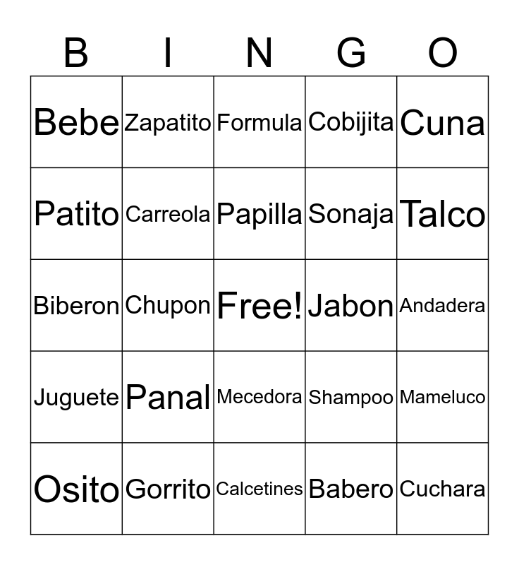 This bingo card has a free space and 24 words: Panal, Gorrito, Papilla, Osito, Cuna, Bebe, Patito, Zapatito, Jabon, Mecedora, Sonaja, Biberon, Shampoo, Mameluco, Carreola, Babero, Andadera, Formula, Talco, Chupon, Cuchara, Juguete, Cobijita and Calcetines.