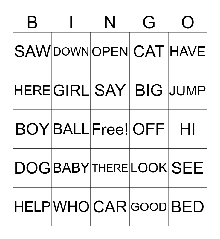 This bingo card has a free space and 24 words: BABY, WHO, SAY, HELP, HAVE, SAW, HERE, DOWN, OFF, THERE, BIG, BOY, LOOK, SEE, GIRL, GOOD, HI, OPEN, JUMP, BALL, BED, DOG, CAT and CAR.