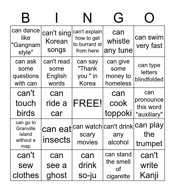 This bingo card has a free space and 24 words: can eat insects, can see a ghost, can say "Thank you " in Korea, can't sew clothes, can swim very fast, can dance like "Gangnam style", can ask some questions with can, can't sing Korean songs, can cook toppoki, can watch scary movies, can give some money to homeless, can't touch birds, can't drink any alcohol, can play the trumpet, can't read some English words, can stand the smell of cigarette, can pronounce this word "auxiliary", can't explain how to get to burrard st from here, can type letters blindfolded, can ride a car, can't write Kanji, can go to Granville island without a map, can whistle any tune and can drink so-ju.
