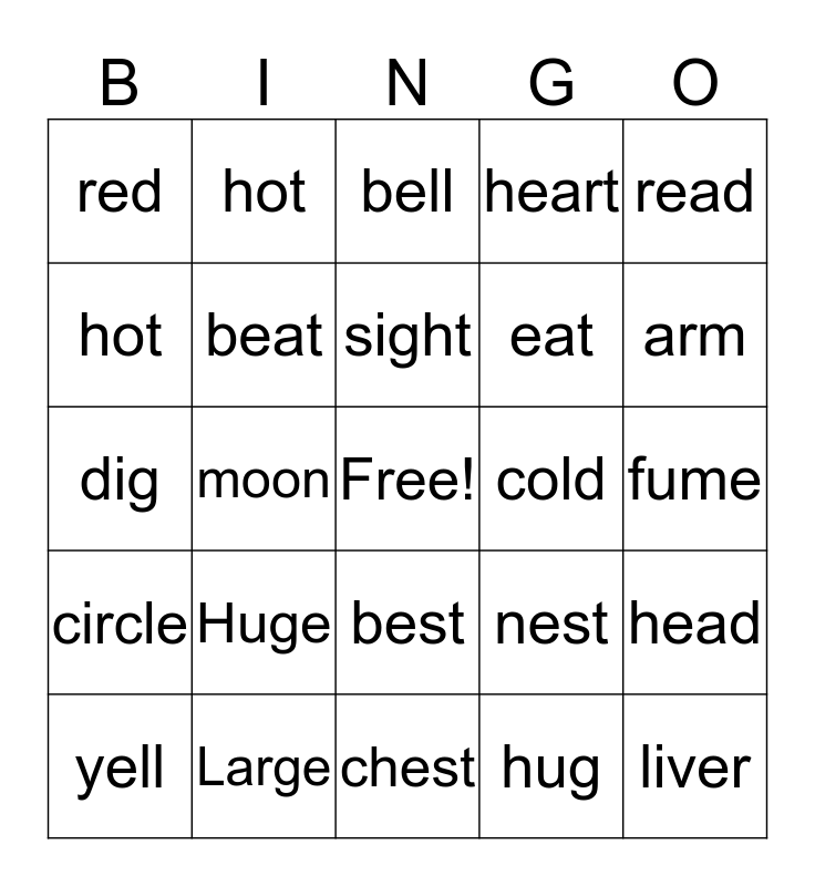 This bingo card has a free space and 24 words: Huge, Large, sight, yell, read, red, hot, hot, cold, best, eat, dig, nest, head, beat, hug, fume, bell, arm, moon, liver, circle, heart and chest.