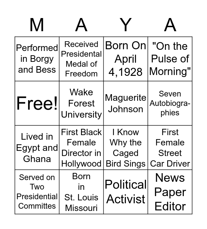 This bingo card has 16 words: Born in St. Louis Missouri, First Female Street Car Driver, Born On April 4,1928, Performed in Borgy and Bess, Lived in Egypt and Ghana, Received Presidental Medal of Freedom, I Know Why the Caged Bird Sings, Political Activist, Free!, Wake Forest University, Served on Two Presidential Committes, "On the Pulse of Morning", First Black Female Director in Hollywood, Seven Autobiogra-phies, Maguerite Johnson and News Paper Editor.