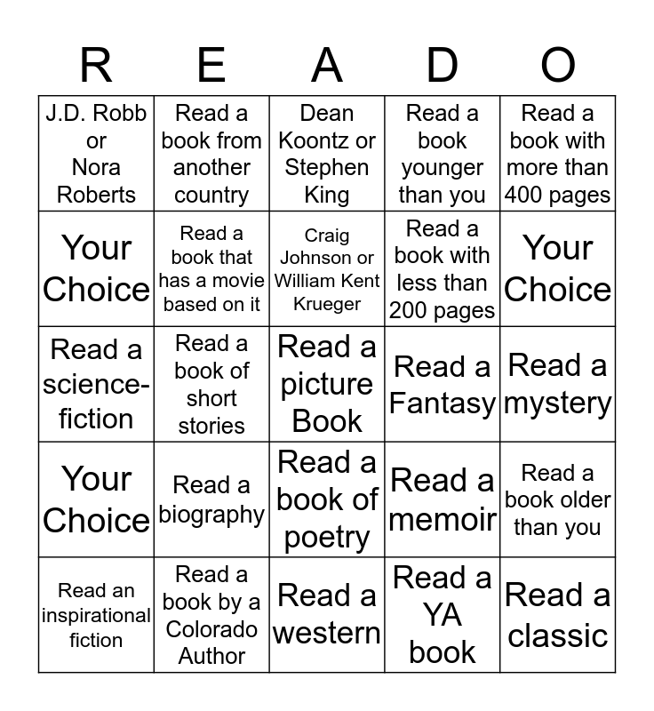 This bingo card has a free space and 24 words: Read a biography, Read a book by a Colorado Author, Craig Johnson or William Kent Krueger, Read an inspirational fiction, Read a book with more than 400 pages, J.D. Robb or Nora Roberts, Your Choice, Read a book from another country, Read a Fantasy, Read a book of poetry, Read a book with less than 200 pages, Read a science-fiction, Read a memoir, Read a book older than you, Read a book that has a movie based on it, Read a YA book, Read a mystery, Dean Koontz or Stephen King, Your Choice, Read a book of short stories, Read a classic, Your Choice, Read a book younger than you and Read a western.