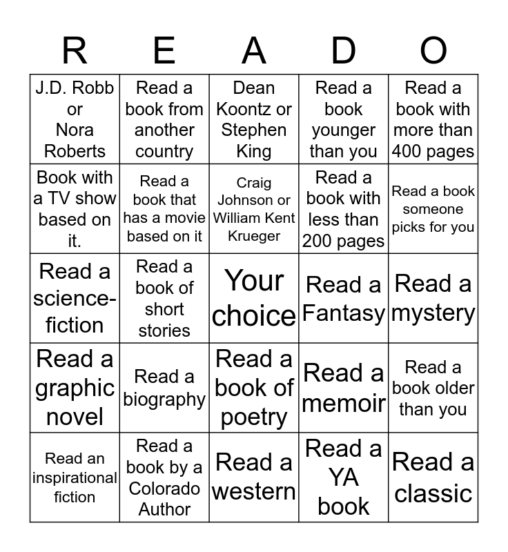 This bingo card has a free space and 24 words: Read a biography, Read a book by a Colorado Author, Craig Johnson or William Kent Krueger, Read an inspirational fiction, Read a book with more than 400 pages, J.D. Robb or Nora Roberts, Book with a TV show based on it., Read a book from another country, Read a Fantasy, Read a book of poetry, Read a book with less than 200 pages, Read a science-fiction, Read a memoir, Read a book older than you, Read a book that has a movie based on it, Read a YA book, Read a mystery, Dean Koontz or Stephen King, Read a book someone picks for you, Read a book of short stories, Read a classic, Read a graphic novel, Read a book younger than you and Read a western.