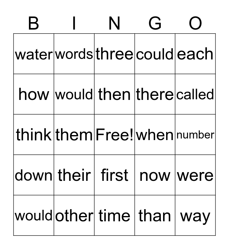 This bingo card has a free space and 49 words: with, way, other, time, their, her, words, about, how, who, would, could, were, now, write, which, then, when, day, each, them, than, water, there, no, called, would, people, first, down, look, which, your, many, other, what, part, about, number, who, sounds, sleeping, owl, campfire, think, three, thank, those and their.