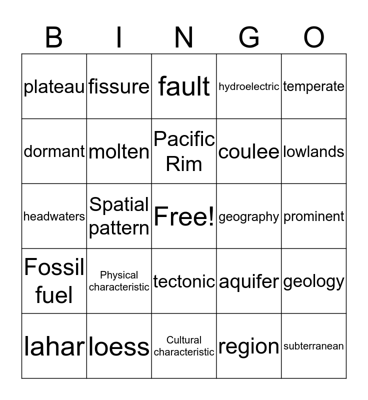 This bingo card has a free space and 27 words: aquifer, commerce, coulee, Cultural characteristic, dormant, fault, fissure, Fossil fuel, geography, geology, headwaters, hydroelectric, lahar, loess, lowlands, metropolitan, molten, Pacific Rim, Physical characteristic, plateau, prominent, region, Spatial pattern, subterranean, tectonic, temperate and tributary.