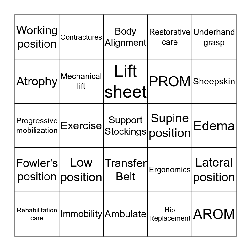 This bingo card has 27 words: Ergonomics, AROM, PROM, Ambulate, Atrophy, Body Alignment, Contractures, Fowler's position, Supine position, Lateral position, Progressive mobilization, Restorative care, Rehabilitation care, Immobility, Sheepskin, Psycho social, Mechanical lift, Lift sheet, Low position, Working position, Edema, Hip Replacement, Exercise, Support Stockings, Transfer Belt, Underhand grasp and abdomen.
