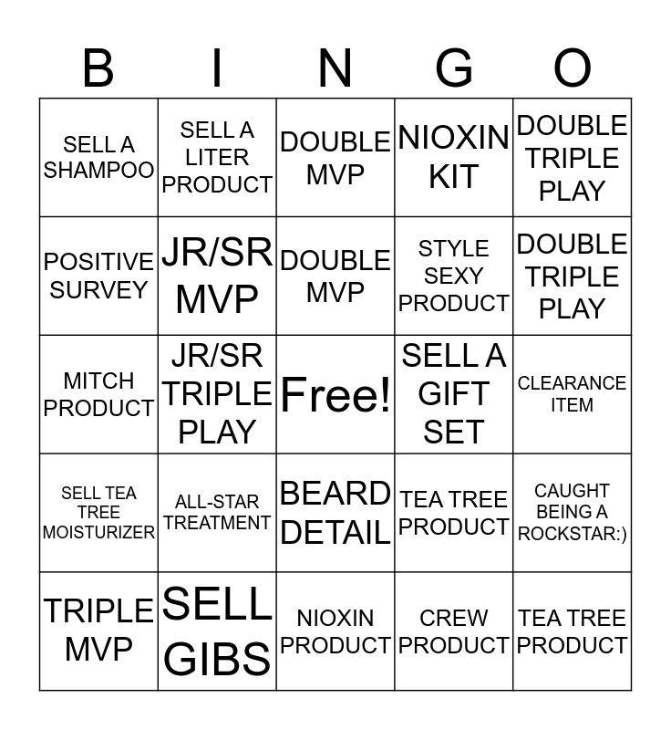 This bingo card has a free space and 24 words: ALL-STAR TREATMENT, SELL GIBS, DOUBLE MVP, TRIPLE MVP, DOUBLE TRIPLE PLAY, SELL A SHAMPOO, POSITIVE SURVEY, SELL A LITER PRODUCT, SELL A GIFT SET, BEARD DETAIL, STYLE SEXY PRODUCT, MITCH PRODUCT, TEA TREE PRODUCT, CAUGHT BEING A ROCKSTAR:), JR/SR MVP, CREW PRODUCT, CLEARANCE ITEM, DOUBLE MVP, DOUBLE TRIPLE PLAY, JR/SR TRIPLE PLAY, TEA TREE PRODUCT, SELL TEA TREE MOISTURIZER, NIOXIN KIT and NIOXIN PRODUCT.