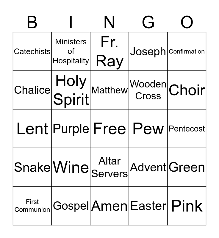 This bingo card has a free space and 24 words: Wine, Gospel, Matthew, First Communion, Confirmation, Catechists, Chalice, Ministers of Hospitality, Pew, Altar Servers, Wooden Cross, Lent, Advent, Green, Holy Spirit, Easter, Pentecost, Fr. Ray, Choir, Purple, Pink, Snake, Joseph and Amen.