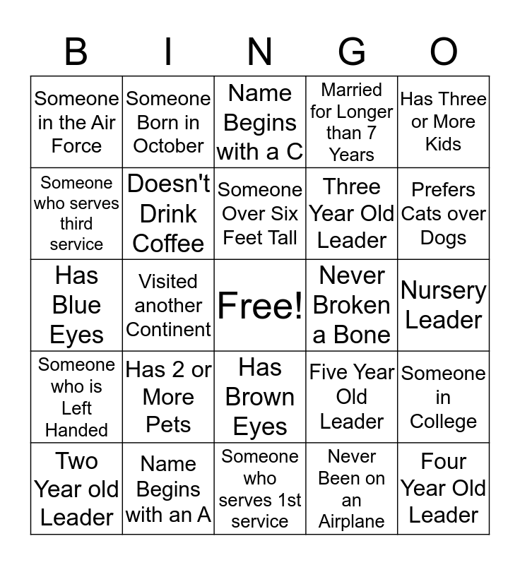 This bingo card has a free space and 24 words: Has 2 or More Pets, Name Begins with an A, Someone Over Six Feet Tall, Two Year old Leader, Has Three or More Kids, Someone in the Air Force, Someone who serves third service, Someone Born in October, Never Broken a Bone, Has Brown Eyes, Three Year Old Leader, Has Blue Eyes, Five Year Old Leader, Someone in College, Doesn't Drink Coffee, Never Been on an Airplane, Nursery Leader, Name Begins with a C, Prefers Cats over Dogs, Visited another Continent, Four Year Old Leader, Someone who is Left Handed, Married for Longer than 7 Years and Someone who serves 1st service.
