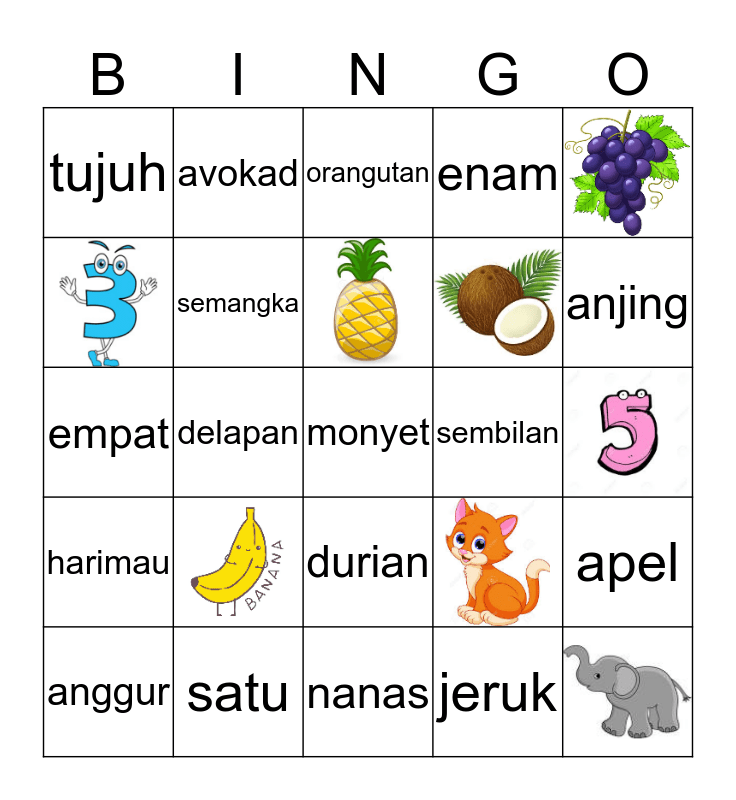 This bingo card has 8 images, a free space and 16 words: satu, anggur, tujuh, avokad, sembilan, durian, empat, apel, semangka, jeruk, orangutan, anjing, delapan, harimau, enam and nanas.