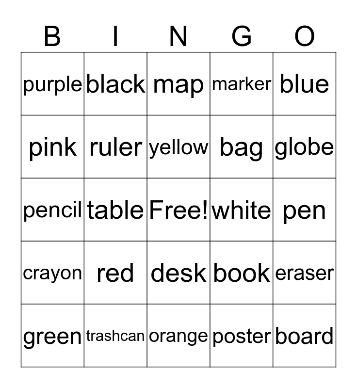 This bingo card has a free space and 25 words: red, orange, yellow, green, blue, purple, pink, black, white, desk, bag, pencil, book, eraser, ruler, chair, pen, map, globe, table, board, trashcan, crayon, marker and poster.