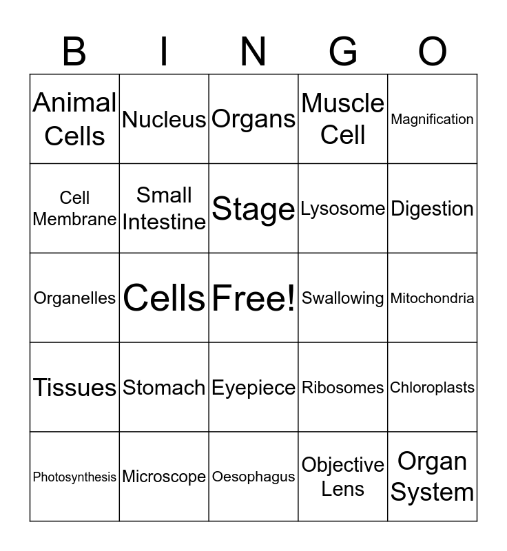 This bingo card has a free space and 26 words: Eyepiece, Objective Lens, Stage, Microscope, Magnification, Animal Cells, Cell Membrane, Nucleus, Mitochondria, Ribosomes, Lysosome, Organelles, Chloroplasts, Photosynthesis, Cells, Organisms, Muscle Cell, Tissues, Organs, Organ System, Digestion, Oesophagus, Swallowing, Stomach, Small Intestine and Liver.