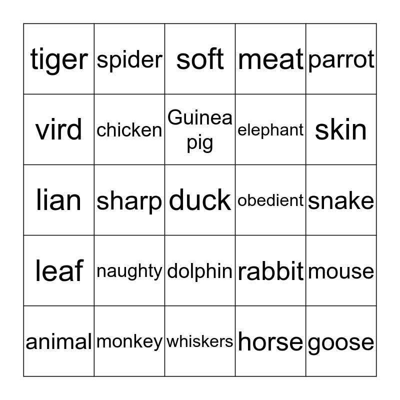 This bingo card has 26 words: dolphin, horse, Guinea pig, monkey, parrot, tiger, vird, spider, snake, rabbit, elephant, lian, mouse, animal, sharp, wild, meat, leaf, soft, duck, skin, whiskers, obedient, naughty, chicken and goose.