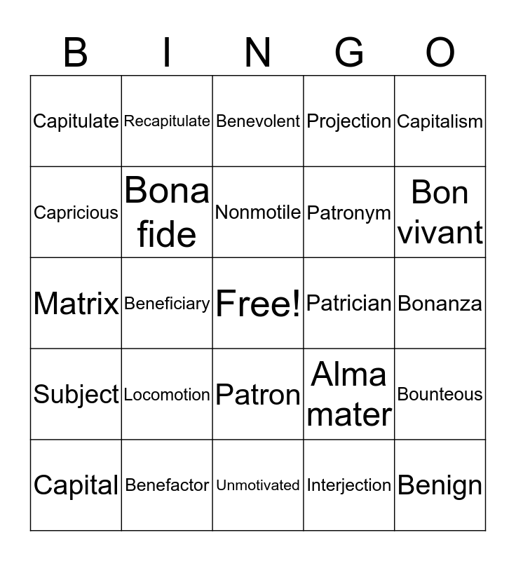 This bingo card has a free space and 25 words: Locomotion, Unmotivated, Nonmotile, Capital, Capitalism, Capitulate, Capricious, Recapitulate, Patrician, Patron, Patronym, Matrix, Alma mater, Bounteous, Bona fide, Benediction, Bonanza, Benevolent, Bon vivant, Beneficiary, Benign, Benefactor, Subject, Projection and Interjection.