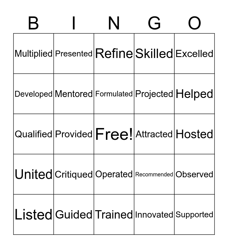 This bingo card has a free space and 24 words: Critiqued, Guided, Formulated, Listed, Excelled, Multiplied, Developed, Presented, Attracted, Operated, Projected, Qualified, Recommended, Observed, Mentored, Innovated, Hosted, Refine, Helped, Provided, Supported, United, Skilled and Trained.