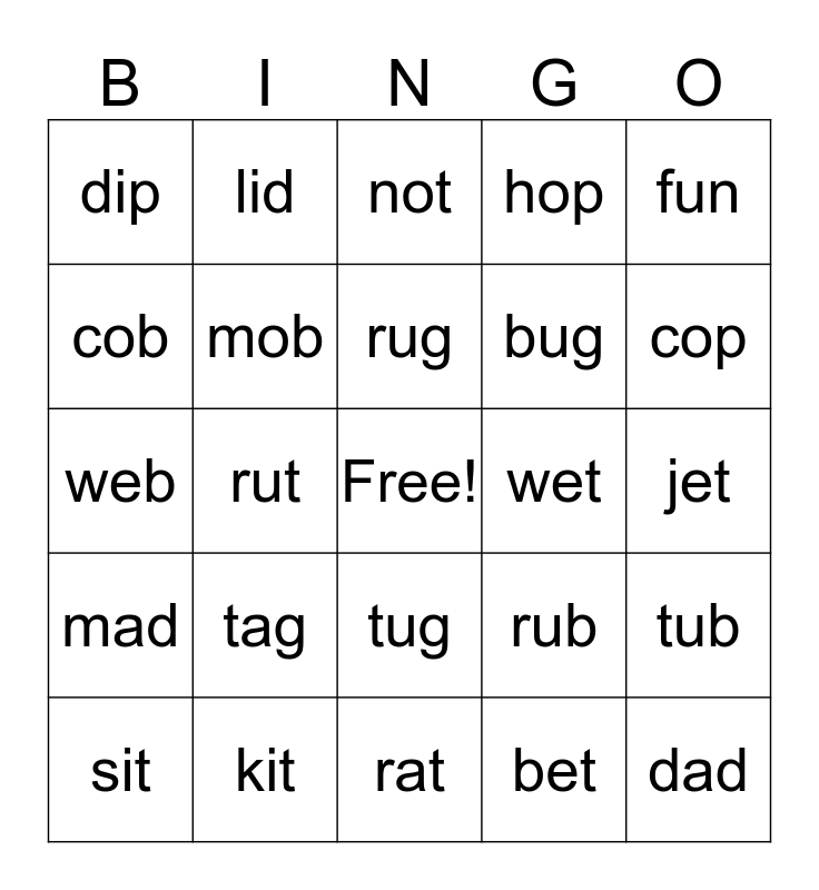 This bingo card has a free space and 24 words: tag, kit, rug, sit, fun, dip, cob, lid, wet, tug, bug, web, rub, tub, mob, bet, jet, not, cop, rut, dad, mad, hop and rat.