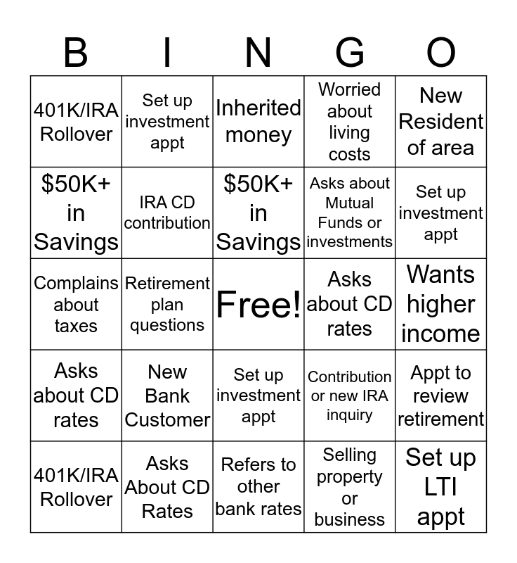 This bingo card has a free space and 24 words: New Bank Customer, Asks About CD Rates, $50K+ in Savings, 401K/IRA Rollover, New Resident of area, 401K/IRA Rollover, $50K+ in Savings, Set up investment appt, Asks about CD rates, Set up investment appt, Asks about Mutual Funds or investments, Complains about taxes, Contribution or new IRA inquiry, Appt to review retirement, IRA CD contribution, Selling property or business, Wants higher income, Inherited money, Set up investment appt, Retirement plan questions, Set up LTI appt, Asks about CD rates, Worried about living costs and Refers to other bank rates.
