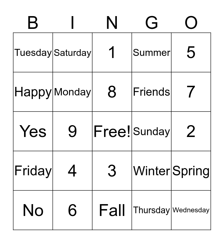 This bingo card has a free space and 24 words: 4, 6, 8, No, 5, Tuesday, Happy, Saturday, Sunday, 3, Friends, Yes, Winter, Spring, Monday, Thursday, 2, 1, 7, 9, Wednesday, Friday, Summer and Fall.