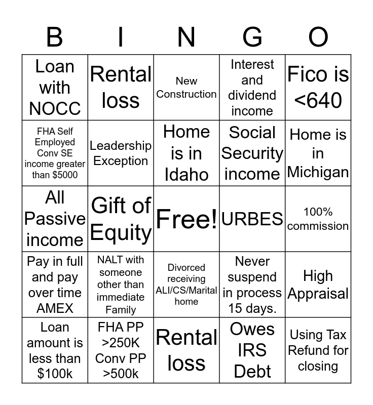 This bingo card has a free space and 24 words: NALT with someone other than immediate Family, FHA PP >250K Conv PP >500k, Home is in Idaho, Loan amount is less than $100k, Fico is <640, Loan with NOCC, FHA Self Employed Conv SE income greater than $5000, Rental loss, URBES, Divorced receiving ALI/CS/Marital home, Social Security income, All Passive income, Never suspend in process 15 days., High Appraisal, Leadership Exception, Owes IRS Debt, 100% commission, New Construction, Home is in Michigan, Gift of Equity, Using Tax Refund for closing, Pay in full and pay over time AMEX, Interest and dividend income and Rental loss.