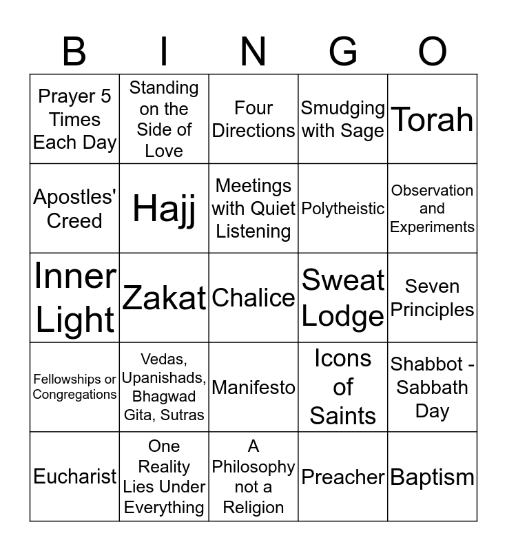 This bingo card has a free space and 24 words: Vedas, Upanishads, Bhagwad Gita, Sutras, One Reality Lies Under Everything, Meetings with Quiet Listening, Eucharist, Torah, Prayer 5 Times Each Day, Apostles' Creed, Standing on the Side of Love, Sweat Lodge, Manifesto, Polytheistic, Inner Light, Icons of Saints, Shabbot - Sabbath Day, Hajj, Preacher, Seven Principles, Four Directions, Observation and Experiments, Zakat, Baptism, Fellowships or Congregations, Smudging with Sage and A Philosophy not a Religion.