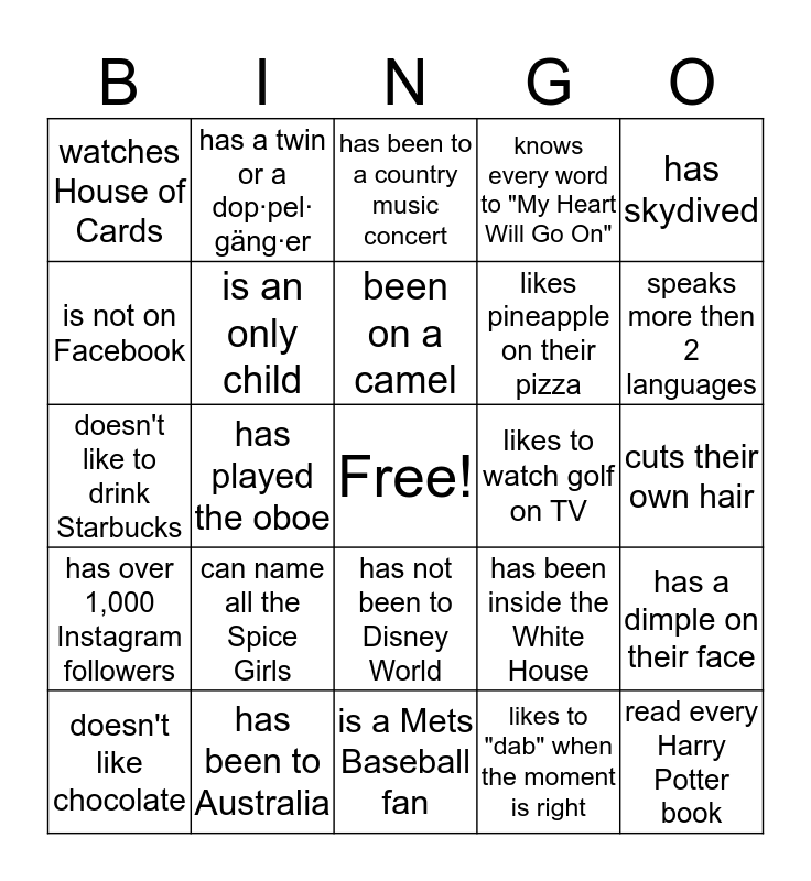 This bingo card has a free space and 24 words: can name all the Spice Girls, has been to Australia, been on a camel, doesn't like chocolate, has skydived, watches House of Cards, is not on Facebook, has a twin or a dop·pel· gäng·er, likes to watch golf on TV, has not been to Disney World, likes pineapple on their pizza, doesn't like to drink Starbucks, has been inside the White House, has a dimple on their face, is an only child, likes to "dab" when the moment is right, cuts their own hair, has been to a country music concert, speaks more then 2 languages, has played the oboe, read every Harry Potter book, has over 1,000 Instagram followers, knows every word to "My Heart Will Go On" and is a Mets Baseball fan.