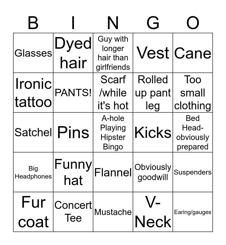 This bingo card has a free space and 25 words: Funny hat, Mustache, Scarf /while it's hot, Fur coat, Cane, Glasses, Ironic tattoo, Dyed hair, Kicks, Flannel, Rolled up pant leg, Satchel, Obviously goodwill, Suspenders, PANTS!, Gender Bender, Bed Head-obviously prepared, Guy with longer hair than girlfriends, Too small clothing, Pins, Earing/gauges, Concert Tee, Big Headphones, Vest and V-Neck.