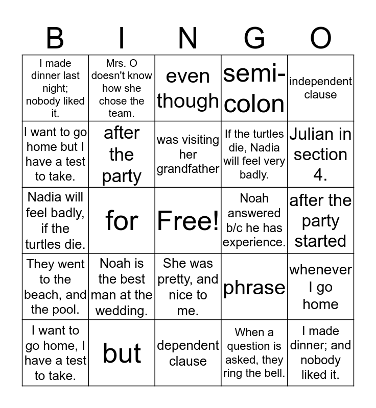 This bingo card has a free space and 24 words: Noah is the best man at the wedding., but, was visiting her grandfather, I want to go home, I have a test to take., independent clause, I made dinner last night; nobody liked it., I want to go home but I have a test to take., Mrs. O doesn't know how she chose the team., Noah answered b/c he has experience., She was pretty, and nice to me., If the turtles die, Nadia will feel very badly., Nadia will feel badly, if the turtles die., phrase, whenever I go home, after the party, When a question is asked, they ring the bell., after the party started, even though, Julian in section 4., for, I made dinner; and nobody liked it., They went to the beach, and the pool., semi-colon and dependent clause.