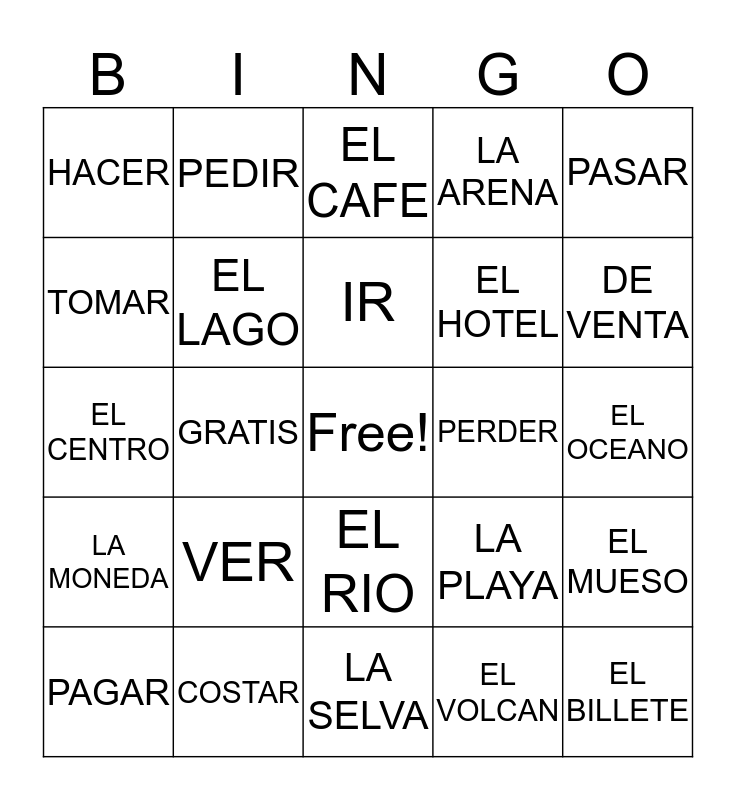 This bingo card has a free space and 24 words: VER, COSTAR, IR, PAGAR, PASAR, HACER, TOMAR, PEDIR, PERDER, EL RIO, EL HOTEL, EL CENTRO, LA PLAYA, EL MUESO, EL LAGO, EL VOLCAN, EL OCEANO, EL CAFE, DE VENTA, GRATIS, EL BILLETE, LA MONEDA, LA ARENA and LA SELVA.