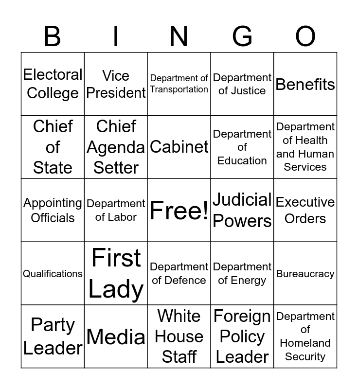 This bingo card has a free space and 24 words: First Lady, Media, Cabinet, Party Leader, Benefits, Electoral College, Chief of State, Vice President, Judicial Powers, Department of Defence, Department of Education, Appointing Officials, Department of Energy, Bureaucracy, Chief Agenda Setter, Foreign Policy Leader, Executive Orders, Department of Transportation, Department of Health and Human Services, Department of Labor, Department of Homeland Security, Qualifications, Department of Justice and White House Staff.