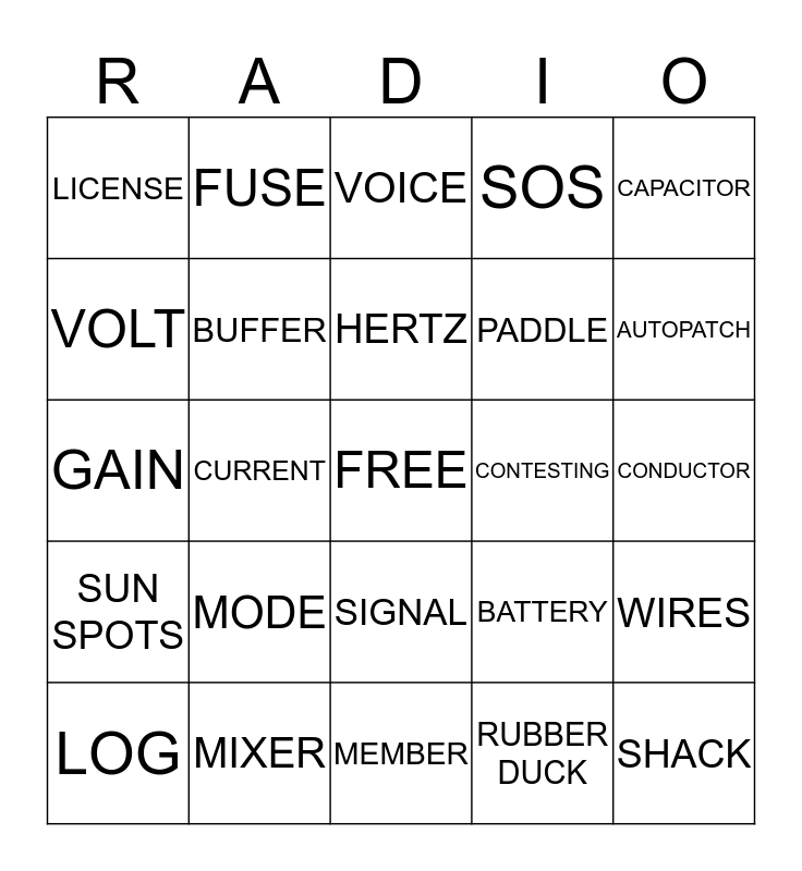 This bingo card has a free space and 24 words: MODE, MIXER, HERTZ, LOG, CAPACITOR, LICENSE, VOLT, FUSE, CONTESTING, SIGNAL, PADDLE, GAIN, BATTERY, WIRES, BUFFER, RUBBER DUCK, CONDUCTOR, VOICE, AUTOPATCH, CURRENT, SHACK, SUN SPOTS, SOS and MEMBER.