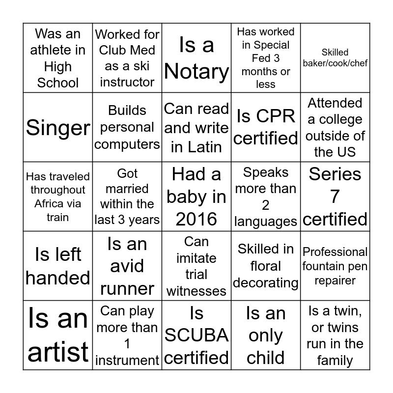 This bingo card has 25 words: Is an avid runner, Is SCUBA certified, Can read and write in Latin, Is an artist, Skilled baker/cook/chef, Was an athlete in High School, Singer, Worked for Club Med as a ski instructor, Speaks more than 2 languages, Can imitate trial witnesses, Is CPR certified, Has traveled throughout Africa via train, Skilled in floral decorating, Professional fountain pen repairer, Builds personal computers, Is a twin, or twins run in the family, Series 7 certified, Is a Notary, Attended a college outside of the US, Got married within the last 3 years, Had a baby in 2016, Can play more than 1 instrument, Is left handed, Has worked in Special Fed 3 months or less and Is an only child.