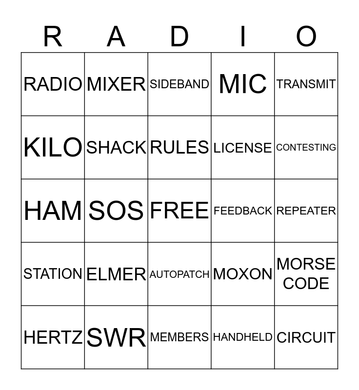 This bingo card has a free space and 24 words: ELMER, SWR, RULES, HERTZ, TRANSMIT, RADIO, KILO, MIXER, FEEDBACK, AUTOPATCH, LICENSE, HAM, MOXON, MORSE CODE, SHACK, HANDHELD, REPEATER, SIDEBAND, CONTESTING, SOS, CIRCUIT, STATION, MIC and MEMBERS.