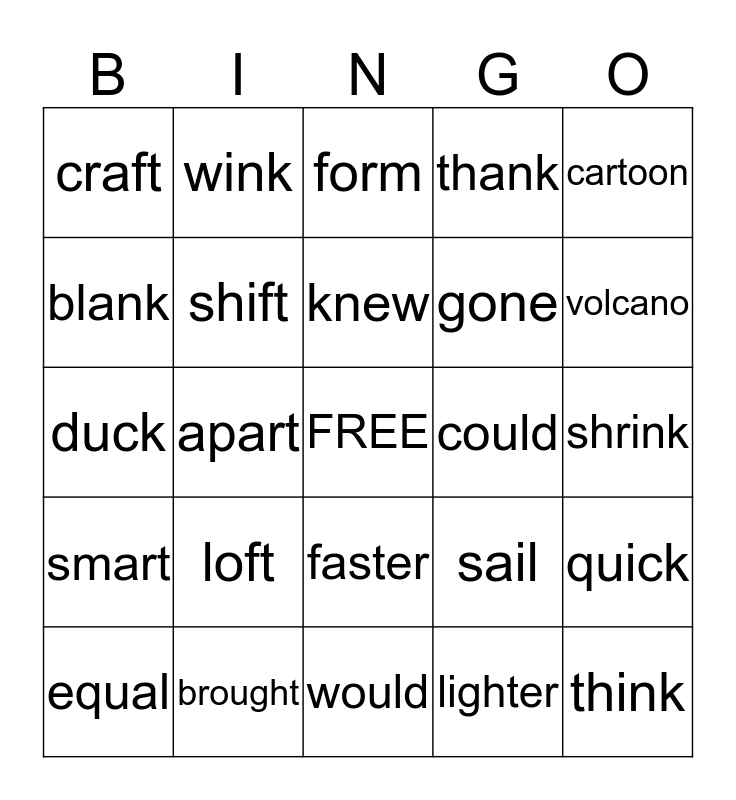 This bingo card has a free space and 29 words: equal, greater, apart, swift, craft, form, shift, loft, could, brought, shrink, think, would, lighter, volcano, wonder, faster, smart, cartoon, duck, sail, chair, gone, blank, thank, wink, quick, knew and knot.