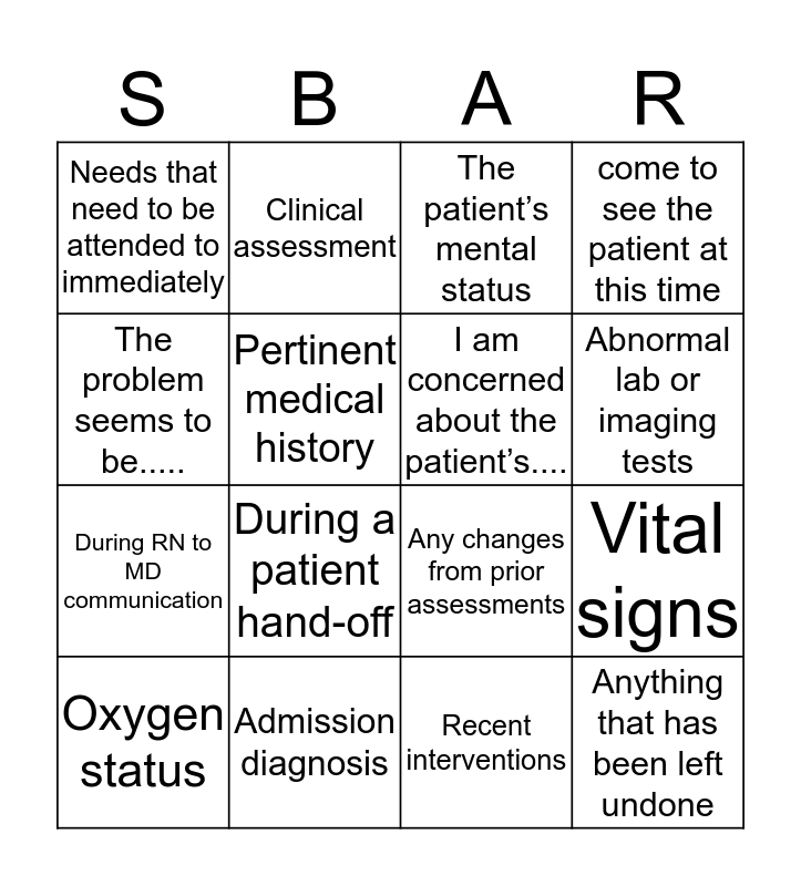 This bingo card has 16 words: Admission diagnosis, Vital signs, The patient’s mental status, Needs that need to be attended to immediately, During RN to MD communication, Clinical assessment, Any changes from prior assessments, Recent interventions, The problem seems to be....., Pertinent medical history, Oxygen status, come to see the patient at this time, During a patient hand-off, Abnormal lab or imaging tests, I am concerned about the patient’s.... and Anything that has been left undone.
