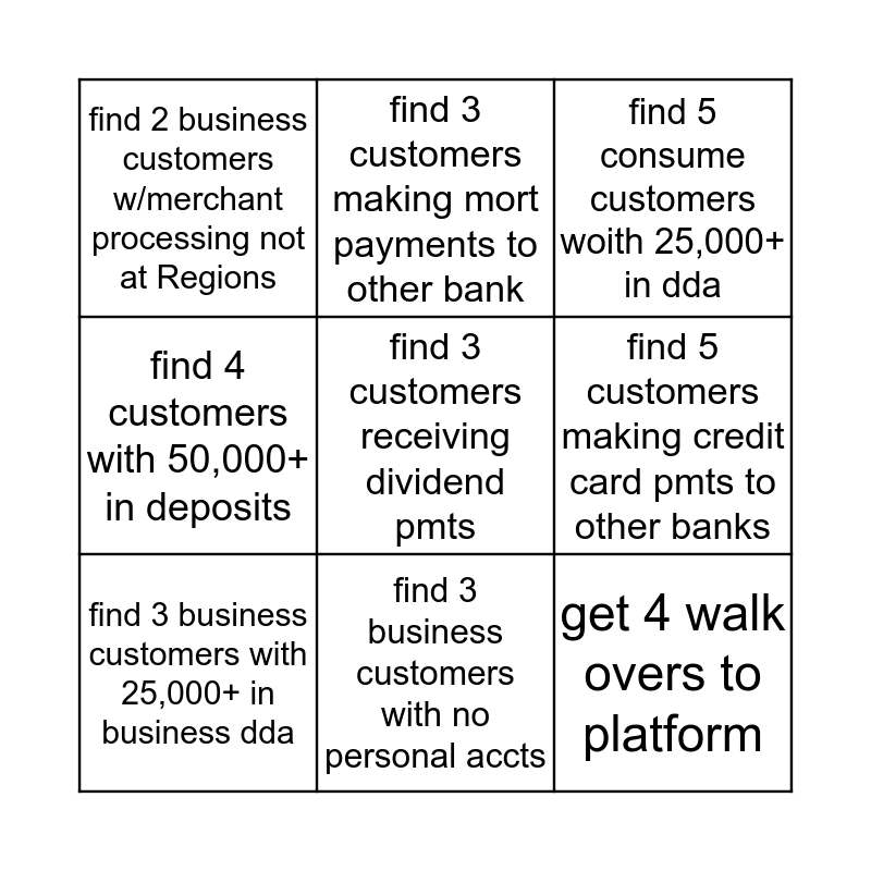 This bingo card has a free space and 8 words: find 5 customers making credit card pmts to other banks, find 5 consume customers woith 25,000+ in dda, find 3 customers making mort payments to other bank, find 3 business customers with 25,000+ in business dda, find 2 business customers w/merchant processing not at Regions, get 4 walk overs to platform, find 4 customers with 50,000+ in deposits and find 3 business customers with no personal accts.