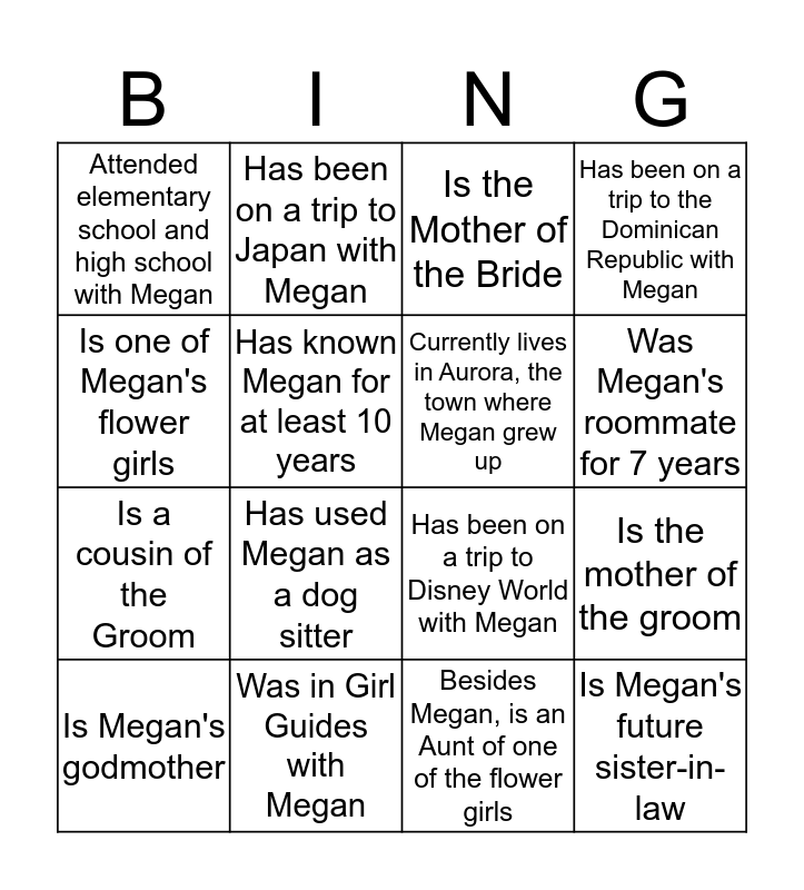 This bingo card has 18 words: Has used Megan as a dog sitter, Is Megan's future sister-in-law, Is the Mother of the Bride, Attended elementary school and high school with Megan, Has been on a trip to Disney World with Megan, Has been on a trip to the Dominican Republic with Megan, Is Megan's godmother, Has been on a trip to Japan with Megan, Was Megan's roommate for 7 years, Is a cousin of the Groom, Besides Megan, is an Aunt of one of the flower girls, Is one of Megan's flower girls, Is the mother of the groom, Has known Megan for at least 10 years, Currently lives in Aurora, the town where Megan grew up, Had Megan as a bridesmaid in her wedding, Was in Girl Guides with Megan and Will most likely be seen doing high-kicks on the dance floor at Megan's wedding.
