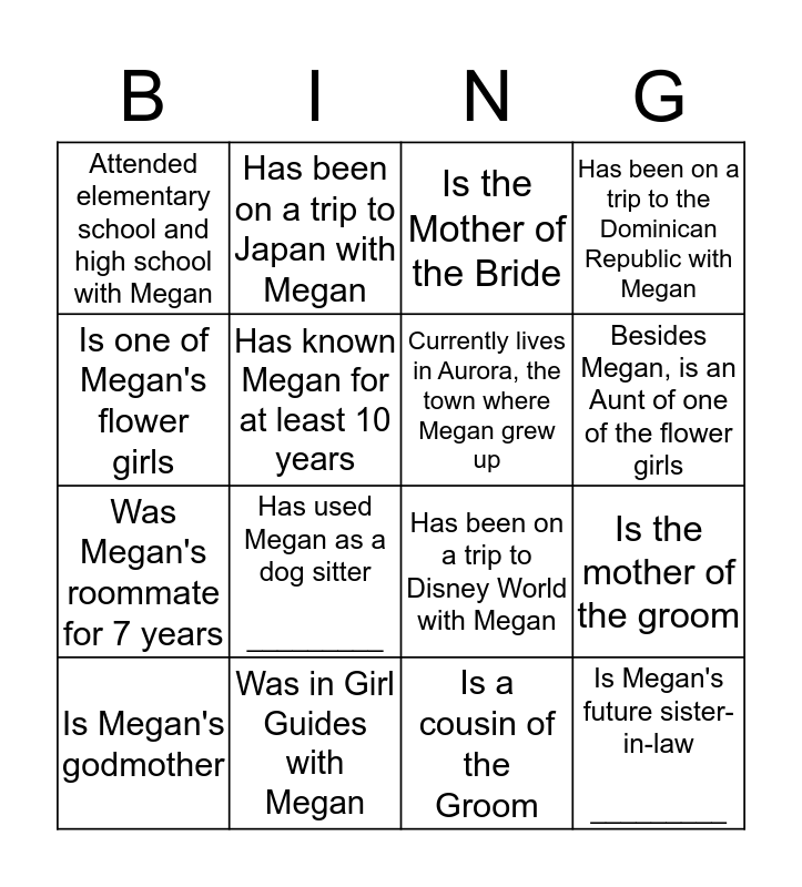 This bingo card has 18 words: Has used Megan as a dog sitter _________, Is Megan's future sister-in-law _________, Is the Mother of the Bride, Attended elementary school and high school with Megan, Has been on a trip to Disney World with Megan, Has been on a trip to the Dominican Republic with Megan, Is Megan's godmother, Has been on a trip to Japan with Megan, Besides Megan, is an Aunt of one of the flower girls, Was Megan's roommate for 7 years, Is a cousin of the Groom, Is one of Megan's flower girls, Is the mother of the groom, Has known Megan for at least 10 years, Currently lives in Aurora, the town where Megan grew up, Had Megan as a bridesmaid in her wedding, Was in Girl Guides with Megan and Will most likely be seen doing high-kicks on the dance floor at Megan's wedding.