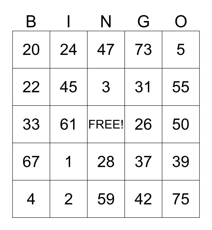 This bingo card has a free space and 24 words: 1, 2, 3, 4, 5, 20, 22, 24, 26, 28, 31, 33, 37, 39, 45, 42, 50, 47, 55, 61, 75, 67, 73 and 59.