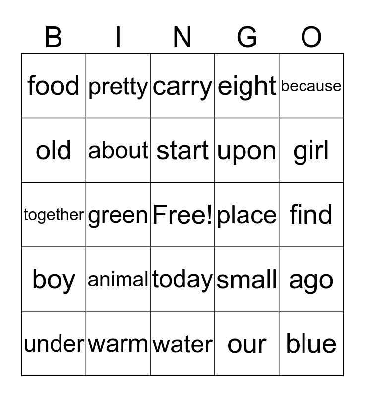 This bingo card has a free space and 24 words: animal, warm, start, under, because, food, old, pretty, place, today, upon, together, small, ago, about, our, find, carry, girl, green, blue, boy, eight and water.