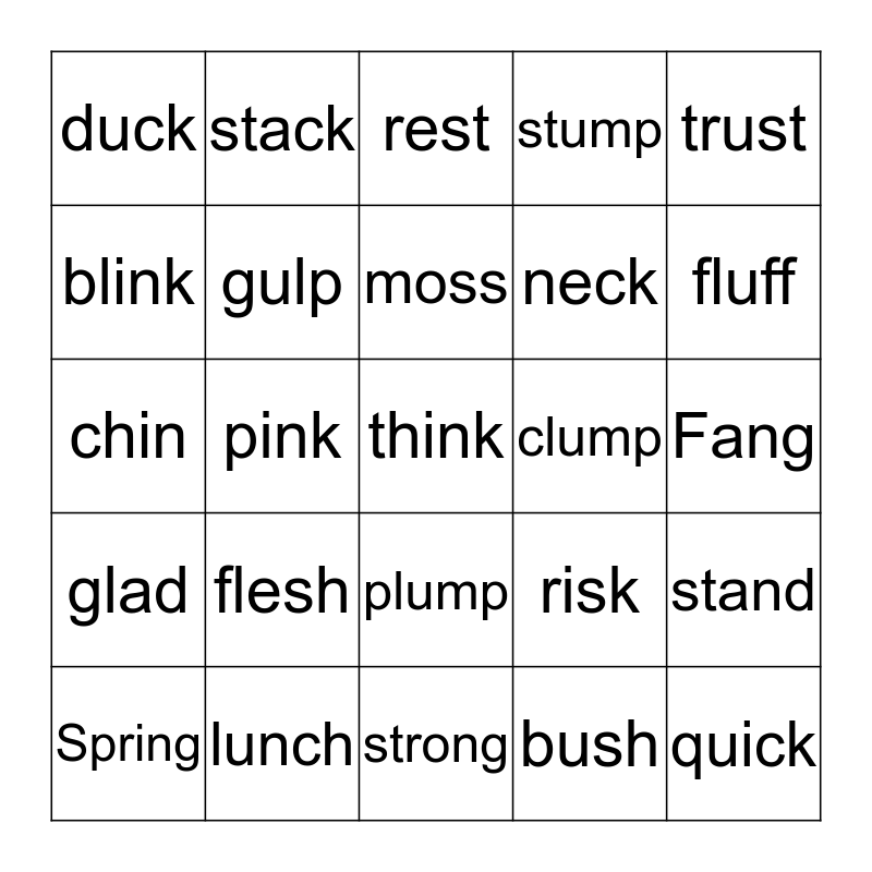 This bingo card has a free space and 24 words: flesh, lunch, moss, Spring, trust, duck, blink, stack, clump, plump, neck, chin, risk, stand, gulp, bush, Fang, rest, fluff, pink, quick, glad, stump and strong.